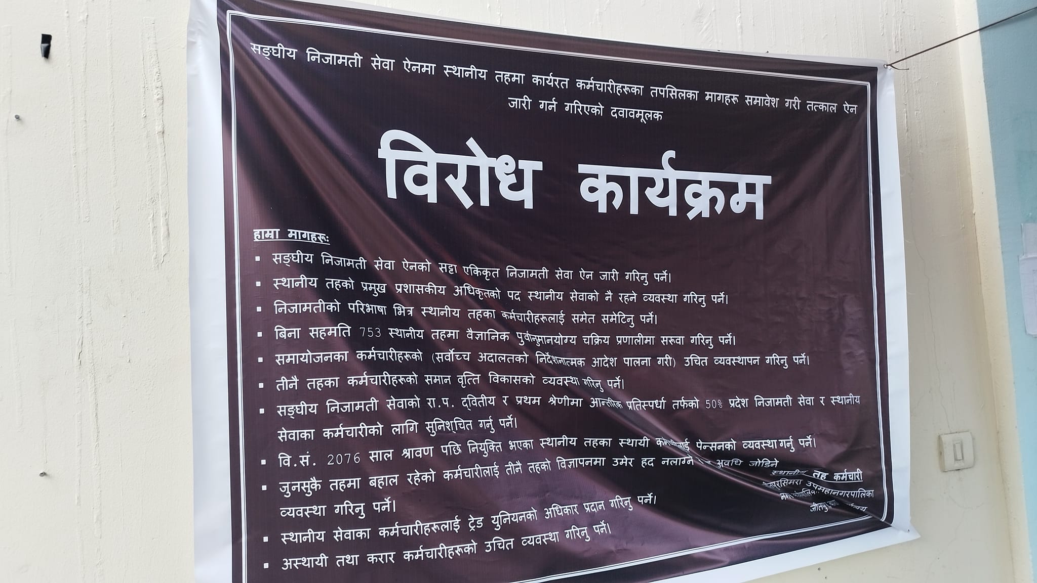 नगरपालीकामा कार्यरत इन्जिनियर संञिव रुपाखेतीले कार्यालयको सवै शाखाबाट सेवाग्राहीका कामकाज बन्द गरी कर्मचारी आन्दोलित रहेको जानकारी दिए ।